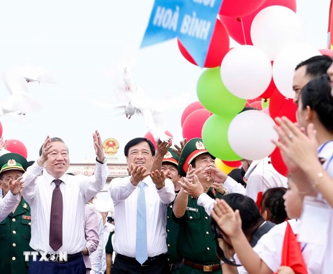| Tổng Bí thư, Chủ tịch nước Tô Lâm và các đại biểu thả chim bồ câu trên cầu Hiền Lương. Ảnh: Thống Nhất/TTXVN |
