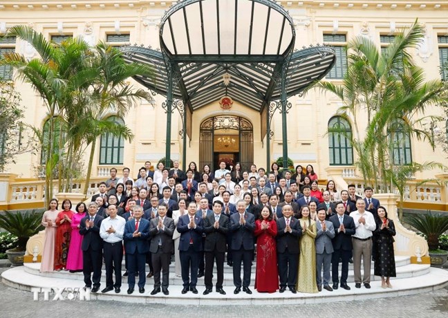 | Tổng Bí thư, Chủ tịch nước Tô Lâm và nguyên Chủ tịch nước Lương Cường chụp ảnh chung với cán bộ, công chức, viên chức, người lao động Văn phòng Chủ tịch nước. Ảnh: Thống Nhất/TTXVN |
