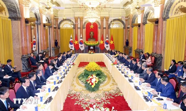| Tổng thống Hàn Quốc Lee Jae Myung và Đoàn cấp cao Hàn Quốc tại hội đàm. (Ảnh: Phạm Kiên/TTXVN) |