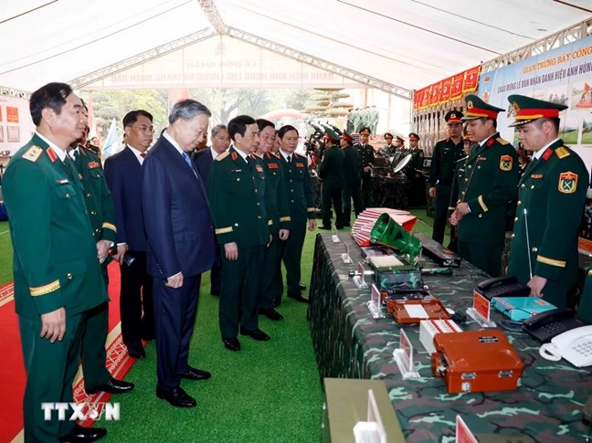 | Tổng Bí thư, Chủ tịch nước Tô Lâm tham quan khu trưng bày các khí tài của Quân khu 1. (Ảnh: Thống Nhất/TTXVN) |