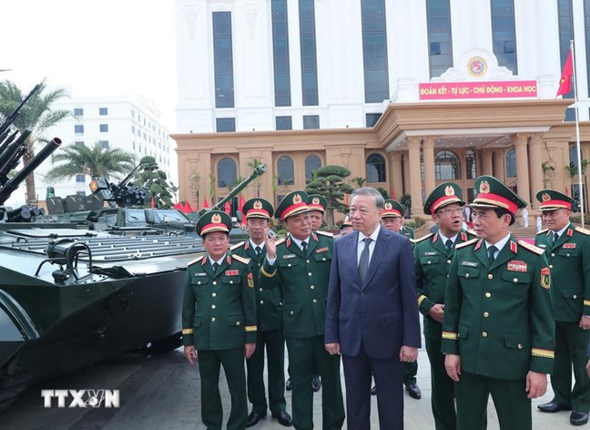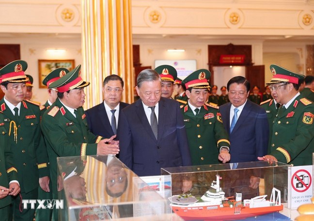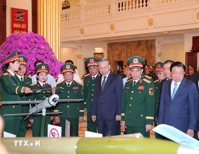 | Tổng Bí thư Tô Lâm và đại biểu tham quan trưng bày các sản phẩm của Tổng cục Công nghiệp Quốc phòng. Ảnh: Trọng Đức/TTXVN |