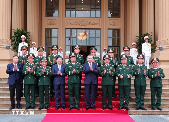 | Tổng Bí thư Tô Lâm với lãnh đạo Bộ Quốc phòng và Tổng cục Công nghiệp Quốc phòng. Ảnh: Trọng Đức/TTXVN |