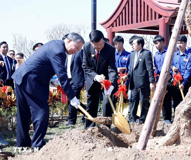 | Tổng Bí thư Tô Lâm cùng Tổng Bí thư, Chủ tịch nước Lào Thongloun Sisoulith trồng cây lưu niệm tại lễ khánh thành Công viên Hữu nghị Lào - Việt Nam. Ảnh: Thống Nhất/TTXVN |