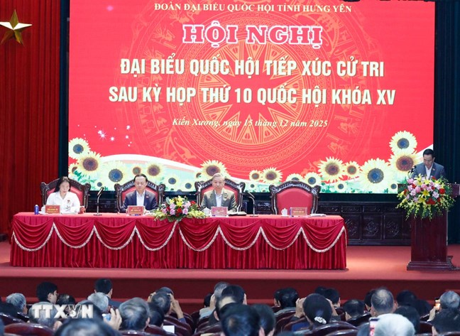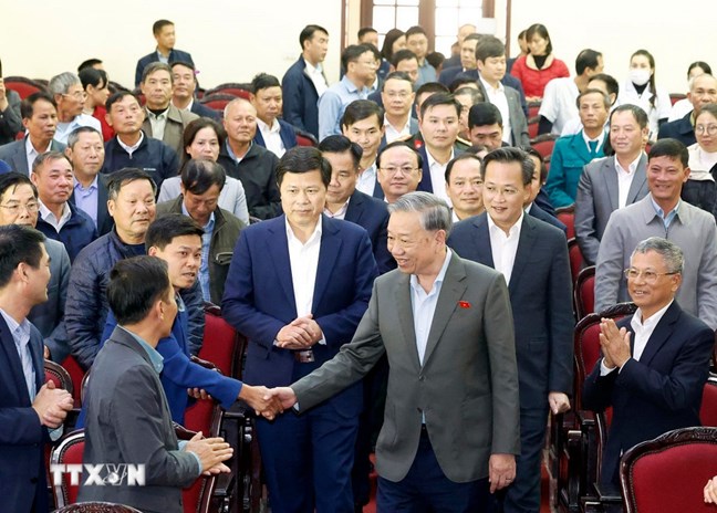 | Tổng Bí thư Tô Lâm và các đại biểu tại buổi tiếp xúc cử tri tỉnh Hưng Yên sau Kỳ họp thứ 10, Quốc hội khóa XV. (Ảnh: Thống Nhất/TTXVN) |