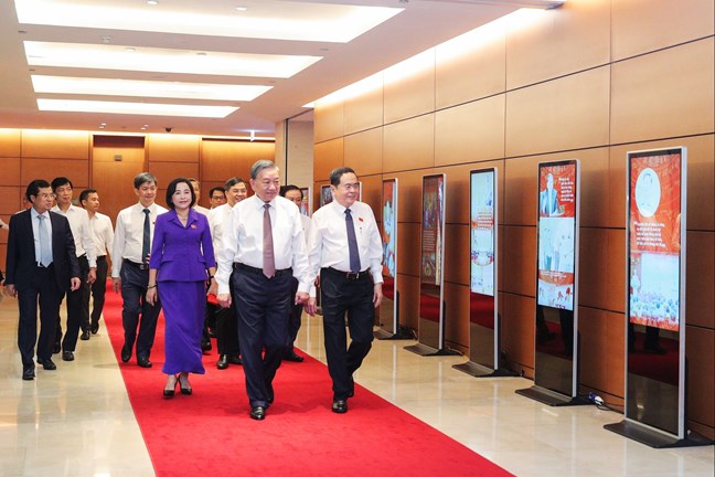 | Tổng Bí thư Tô Lâm, Chủ tịch Quốc hội Trần Thanh Mẫn cùng các đại biểu tham quan khu trưng bày tại hành lang và sảnh phòng họp Diên Hồng về kết quả chuyển đổi số của Quốc hội. Ảnh: Hồ Long |