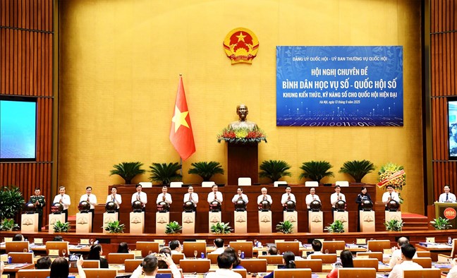 Phát biểu tại Hội nghị, Tổng Bí thư Tô Lâm nêu rõ, để thực hiện thành công yêu cầu nhanh chóng phổ cập tri thức cơ bản về chuyển đổi số cho toàn dân, học tập Bác Hồ động viên toàn dân học tập, học tập suốt đời. Diệt giặc dốt, toàn dân đã tham gia “Bình dân học vụ” để xóa mù chữ. Giặc dốt bị tiêu diệu, để tiến kịp, tiến cùng thời đại, toàn dân cần tích cực tham gia phong trào “Bình dân học vụ số”. Hôm nay, “Bình dân học vụ số - Quốc hội số” được khởi động với khát vọng phổ cập tri thức số đến mọi đại biểu và cán bộ trong hệ thống Quốc hội, tiếp nối truyền thống hiếu học, cầu thị của dân tộc ta trong thời đại mới.