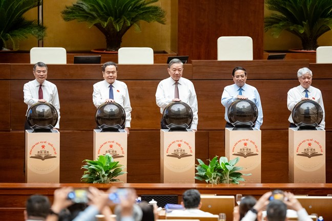 | Tổng Bí thư Tô Lâm, Thủ tướng Chính phủ Phạm Minh Chính và Chủ tịch Quốc hội Trần Thanh Mẫn cùng Lãnh đạo, Đảng, Nhà nước, Quốc hội thực hiện nghi thức bấm nút khai trương Nền tảng “Bình dân học vụ số - Quốc hội số". Ảnh: Phạm Thắng |