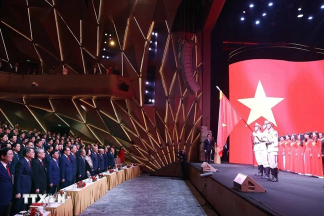 | Tổng Bí thư Tô Lâm, các đồng chí lãnh đạo, nguyên lãnh đạo Đảng Nhà nước và các đại biểu đến thực hiện nghi lễ chào cờ. Ảnh: Thống Nhất/TTXVN |