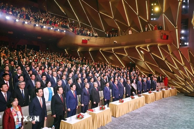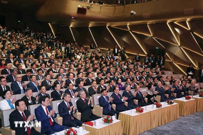 | Tổng Bí thư Tô Lâm, các đồng chí lãnh đạo, nguyên lãnh đạo Đảng Nhà nước và các đại biểu đến dự. Ảnh: Thống Nhất/TTXVN |