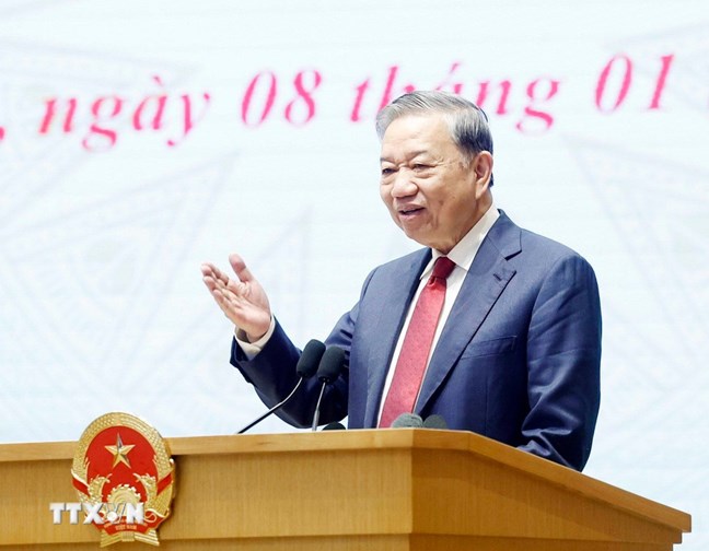 | Tổng Bí thư Tô Lâm và các đồng chí lãnh đạo Đảng, Nhà nước dự Hội nghị tổng kết công tác năm 2025, triển khai công tác năm 2026 của Chính phủ và chính quyền địa phương. Ảnh: TTXVN |