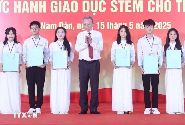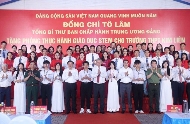 Chiều cùng ngày, Tổng Bí thư Tô Lâm và Đoàn công tác của Trung ương đã đến thăm Trường Trung học Phổ thông Kim Liên (huyện Nam Đàn), tặng một phòng học STEM và tặng 100 suất quà cho học sinh tiêu biểu. Món quà là nguồn động viên to lớn đối với thầy trò nhà trường và góp phần truyền cảm hứng đam mê khoa học tiếp tục thắp sáng những ý tưởng sáng tạo được khởi nguồn cho học sinh tại địa phương không ngừng nỗ lực học tập, nghiên cứu, ứng dụng khoa học công nghệ vào thực tiễn cuộc sống và công việc hằng ngày, để tương lai đóng góp ngày càng nhiều hơn cho quê hương, đất nước.