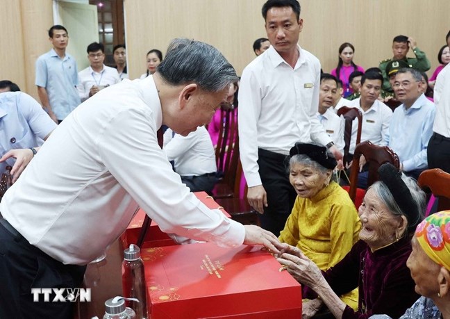 Tổng Bí thư Tô Lâm và Đoàn công tác của Trung ương cũng đã tặng quà cho 25 gia đình người có công, gia đình chính sách huyện Nam Đàn, cán bộ, công chức viên chức, người lao động tại Khu Di tích. Tổng Bí thư Tô Lâm bày tỏ vui mừng được về thăm quê hương Bác đúng dịp kỷ niệm 135 Ngày sinh Chủ tịch Hồ Chí Minh để cùng ôn lại truyền thống lịch sử vẻ vang của dân tộc và tưởng nhớ những công lao to lớn của Bác Hồ đối với quê hương đất nước và tỉnh Nghệ An.