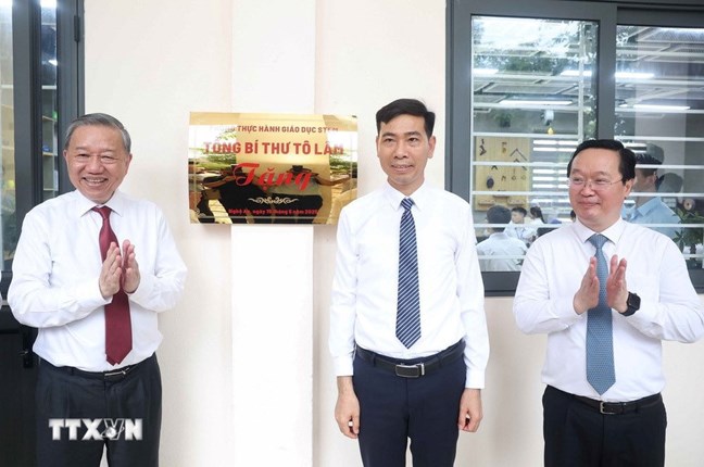 | Tổng Bí thư Tô Lâm tặng phòng học STEM cho Trường THPT Kim Liên. Ảnh: Thống Nhất/TTXVN |