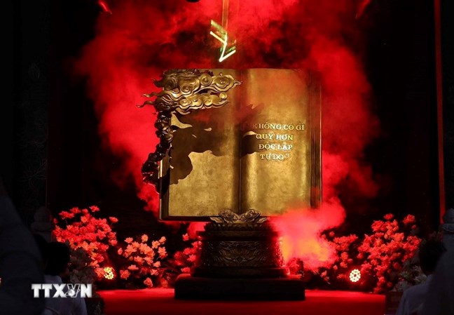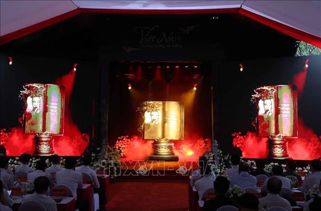 Tổng Bí thư Tô Lâm trao tặng Đảng bộ, chính quyền và nhân dân tỉnh Nghệ An tác phẩm điêu khắc ánh sáng “Việt Nam - Những Trang sử Vàng”, Tác phẩm tôn vinh Chủ tịch Hồ Chí Minh - Người đã viết nên những trang sử vàng của dân tộc Việt Nam. Tác phẩm có kích thước đặc biệt với chiều cao 1945mm; chiều rộng 2025mm; tổng trọng lượng khoảng 3 tấn, được làm bằng chất liệu đồng đúc nguyên khối, có hình dáng của một cuốn sách lịch sử, hàm nghĩa Lịch sử Việt Nam là một pho sử bằng vàng và Chủ tịch Hồ Chí Minh là người viết lên những trang sử vàng chói lọi trong lịch sử đương đại của dân tộc. Chiều cao 1945mm gợi nhớ dấu ấn thiêng liêng trong lịch sử dân tộc. Đó là năm Chủ tịch Hồ Chí Minh đọc Bản Tuyên ngôn Độc lập tại Quảng trường Ba Đình khai sinh nước Việt Nam Dân chủ Cộng hòa. Chiều rộng 2025mm biểu trưng cho dấu mốc hiện tại - năm 2025 - cả đất nước hướng về 50 năm thống nhất non sông và kỷ niệm 135 năm Ngày sinh của Người. 79 trang sách tượng trưng cho 79 mùa xuân Bác Hồ đã sống trọn cho đất nước, cho nhân dân.