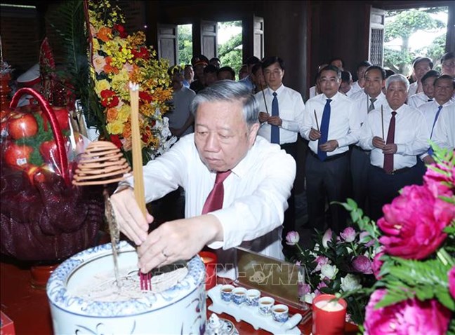 | Tổng Bí thư Tô Lâm và đoàn công tác dâng hương tại đền Chung Sơn thờ gia tiên Bác Hồ. Ảnh: Thống Nhất/TTXVN |