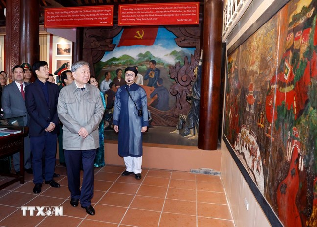 Ngay sau lễ dâng hương, Tổng Bí thư Tô Lâm cùng Đoàn đại biểu đã thăm quan khu trưng bày tư liệu, hiện vật, Nhà lưu niệm - nơi gắn bó những năm tháng tuổi thơ của Tổng Bí thư Nguyễn Văn Cừ.