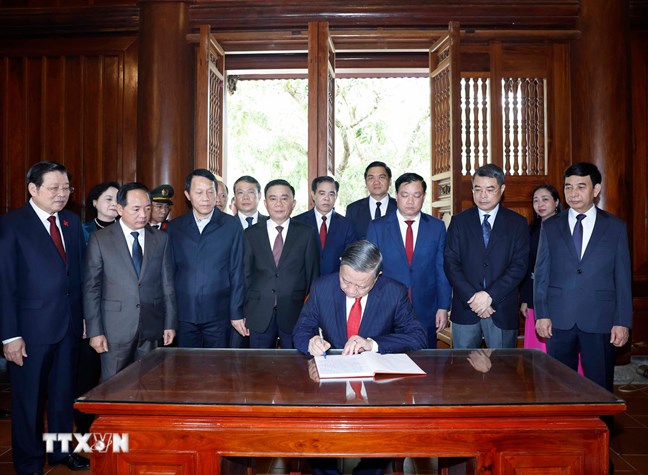| Tổng Bí thư Tô Lâm ghi sổ lưu bút tại Khu Di tích Quốc gia Đặc biệt Kim Liên. (Ảnh: Thống Nhất/TTXVN) |