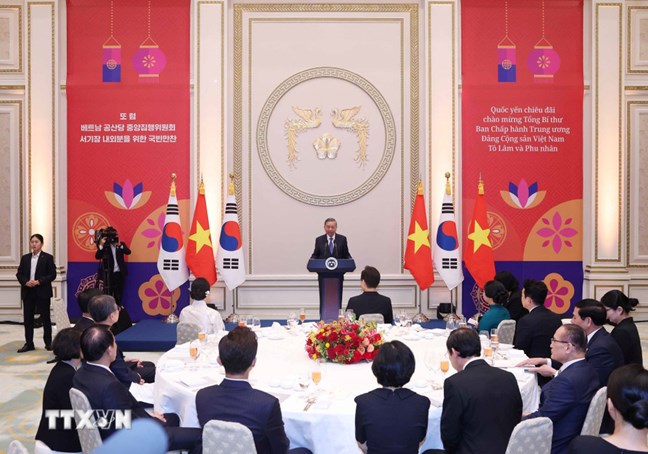 Trong khuôn khổ chuyến thăm cấp Nhà nước tới Hàn Quốc, tối 11/8, Tổng Bí thư Tô Lâm và Phu nhân cùng Đoàn đại biểu cấp cao Việt Nam đã dự chiêu đãi cấp Nhà nước do Tổng thống Hàn Quốc Lee Jae Myung và Phu nhân chủ trì.
