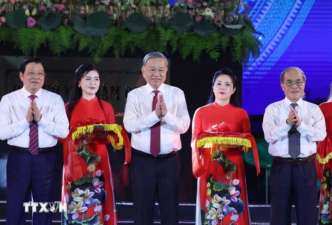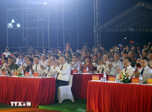 | Tổng Bí thư Tô Lâm và các đại biểu dự khai mạc Lễ hội Làng Sen. Ảnh: Thống Nhất/TTXVN |