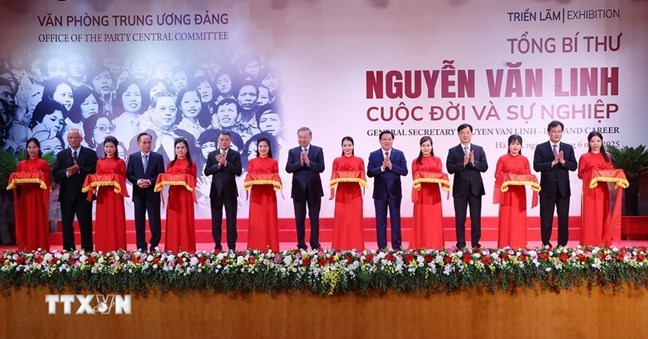 | Tổng Bí thư Tô Lâm và các đại biểu cắt băng khai mạc Triển lãm "Tổng Bí thư Nguyễn Văn Linh - Cuộc đời và sự nghiệp". Ảnh: Văn Điệp/TTXVN |