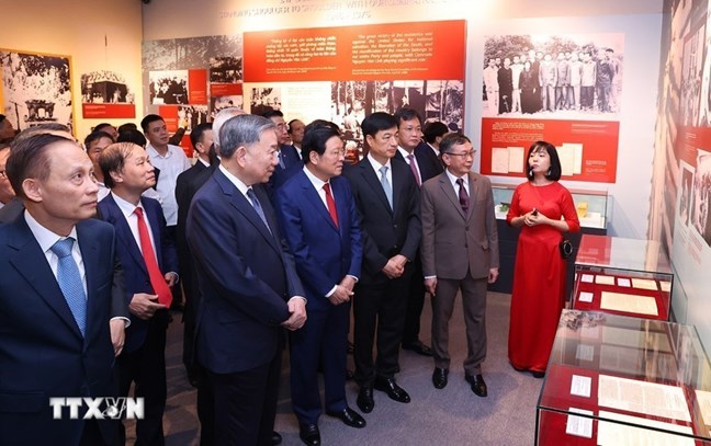 | Tổng Bí thư Tô Lâm và các đại biểu dự Triển lãm "Tổng Bí thư Nguyễn Văn Linh - Cuộc đời và sự nghiệp". Ảnh: Văn Điệp/TTXVN |