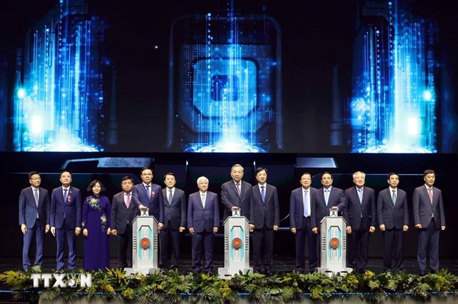 | Tổng Bí thư Tô Lâm và các đồng chí lãnh đạo Đảng, Nhà nước thực hiện nghi thức khởi động chương trình Stem Innovation Petrovietnam. Ảnh: Thống Nhất/TTXVN |