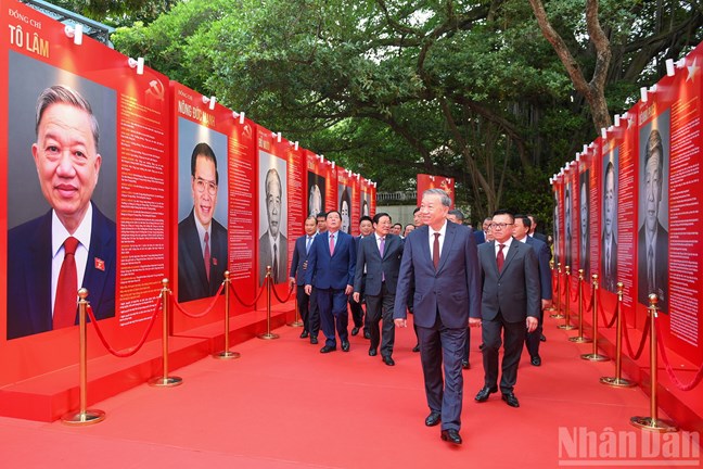 | Tổng Bí thư Tô Lâm và các đại biểu tham quan khu triển lãm về các Tổng Bí thư của Đảng tại Báo Nhân Dân. (Ảnh: ĐĂNG KHOA) |