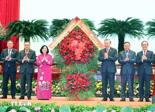 | Tổng Bí thư Tô Lâm tặng hoa chúc mừng Đại hội đại biểu Đảng bộ thành phố Hà Nội lần thứ 18. Ảnh: Thống Nhất/TTXVN |