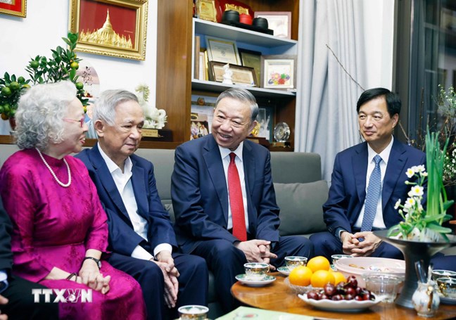| Tổng Bí thư Tô Lâm thăm, chúc Tết gia đình Giáo sư, Tiến sỹ, Nhà giáo Nhân dân Nguyễn Lân Dũng và Phó Giáo sư, Tiến sỹ, Thầy thuốc Nhân dân Nguyễn Kim Nữ Hiếu. Ảnh: Thống Nhất/TTXVN |
