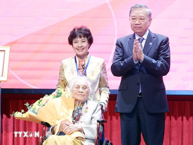 | Tổng Bí thư Tô Lâm trao danh hiệu Anh hùng Lao động cho đồng chí Nguyễn Thị Bình, nguyên Ủy viên Trung ương Đảng, nguyên Phó Chủ tịch nước, nguyên Bộ Trưởng Bộ Ngoại giao Chính phủ cách mạng lâm thời Cộng hòa miền Nam Việt Nam. (Ảnh: Thống Nhất/TTXVN) |
