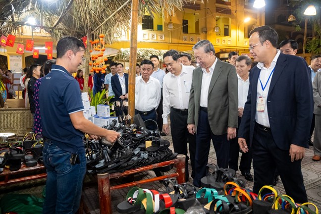 | Tổng Bí thư Tô Lâm, Chủ tịch Quốc hội Trần Thanh Mẫn cùng các đại biểu tham quan các gian hàng OCOP tại Ngày hội |