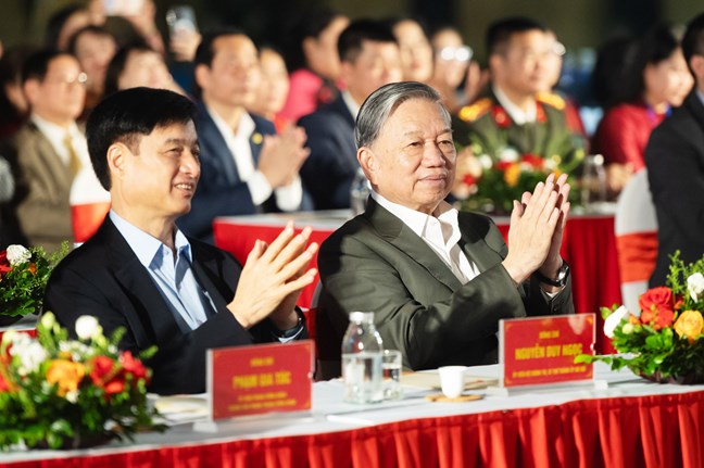 | Tổng Bí thư Tô Lâm, Chủ tịch Quốc hội Trần Thanh Mẫn cùng các đại biểu chụp ảnh lưu niệm với đội văn nghệ biểu diễn tại Ngày hội |
