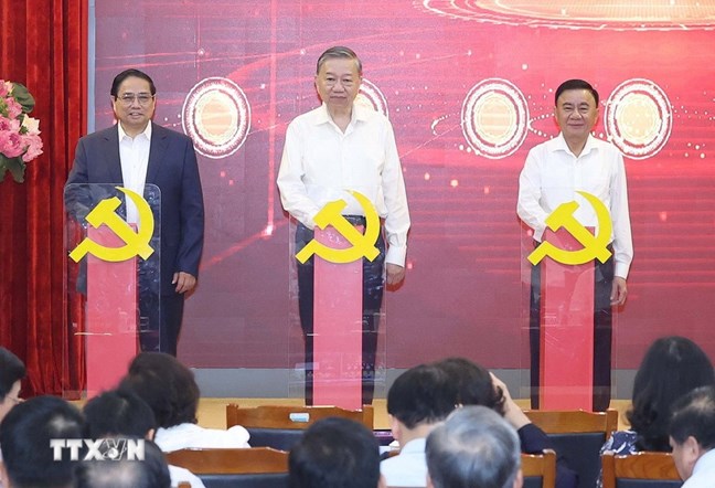 | Tổng Bí thư Tô Lâm, Trưởng Ban Chỉ đạo Trung ương và các đại biểu thực hiện nghi thức ra mắt 3 nền tảng số phục vụ triển khai Nghị quyết 57-NQ/TW. Ảnh: Thống Nhất/TTXVN |