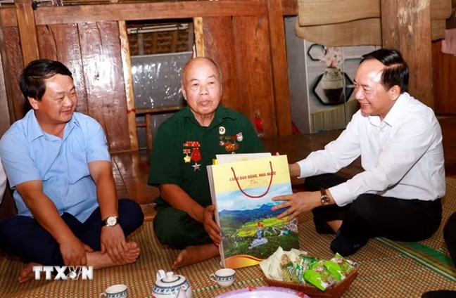 Ông Trịnh Văn Quyết, Ủy viên Bộ Chính trị, Bí thư Trung ương Đảng, Trưởng Ban Tuyên giáo và Dân vận Trung ương thăm, tặng quà cho gia đình ông Nguyễn Xuân Chè, bệnh binh (tổ 32, thôn Tha, phường Hà Giang 1). (Ảnh: Đức Thọ/TTXVN)