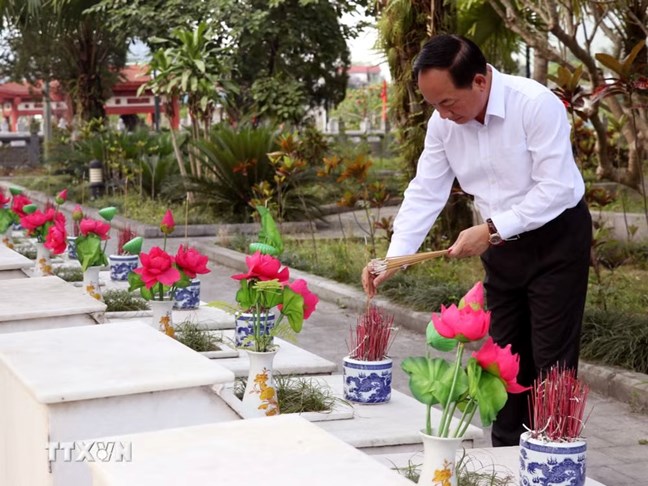 Ông Trịnh Văn Quyết, Ủy viên Bộ Chính trị, Bí thư Trung ương Đảng, Trưởng Ban Tuyên giáo và Dân vận Trung ương dâng hương, viếng các Anh hùng liệt sỹ tại Nghĩa trang Liệt sỹ Vị Xuyên. (Ảnh: Đức Thọ/TTXVN)