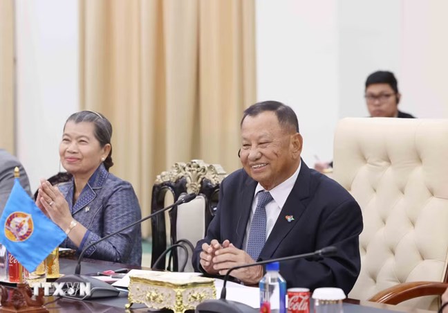 | Phó Chủ tịch, Trưởng Ban Thường trực Ban Thường vụ Đảng Nhân dân Campuchia Say Chhum tại hội đàm. Ảnh: Phương Hoa/TTXVN |