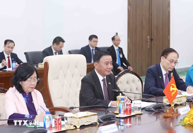 | Thường trực Ban Bí thư Trần Cẩm Tú hội đàm với Phó Chủ tịch, Trưởng Ban Thường trực Ban Thường vụ CPP Say Chhum. Ảnh: Phương Hoa/TTXVN |
