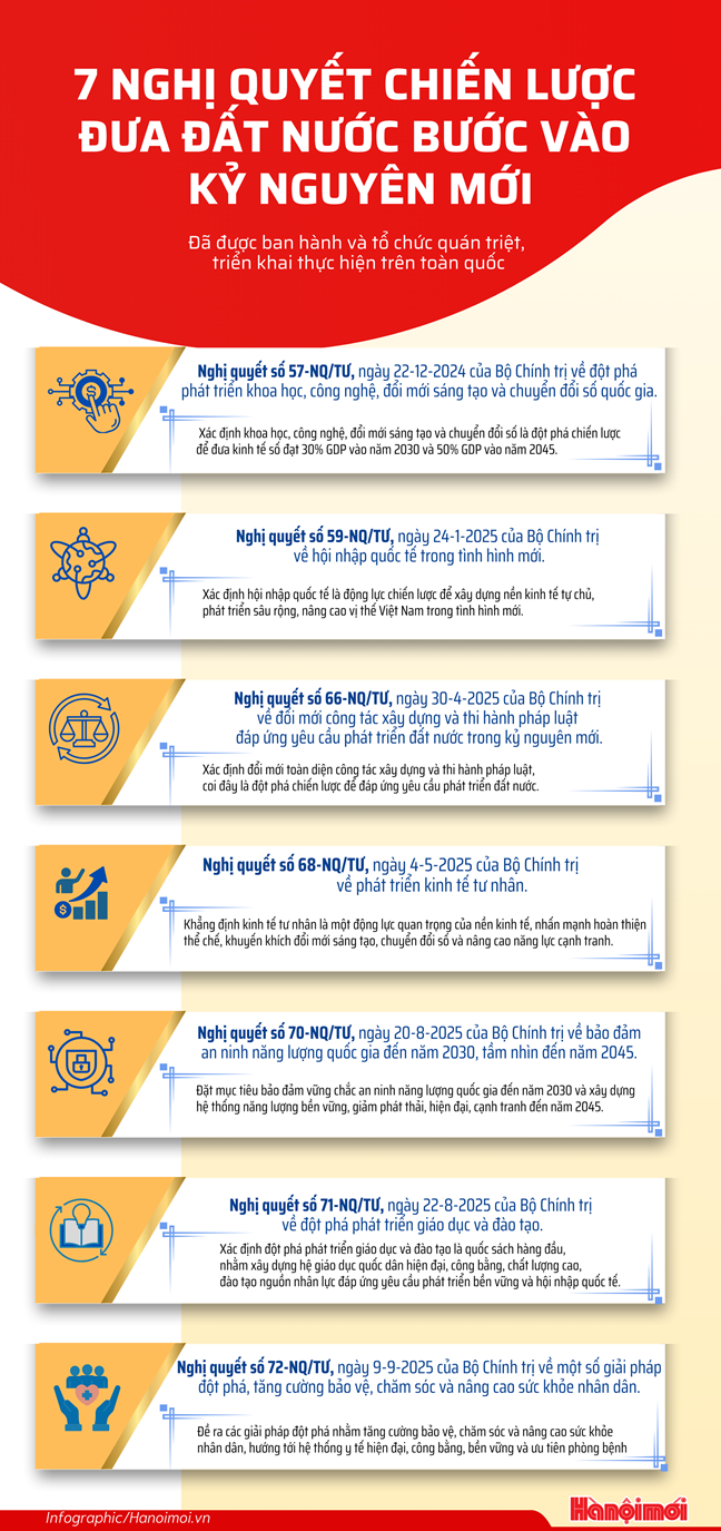 Cuối năm 2024 và trong năm 2025, Bộ Chính trị đã ban hành nhiều nghị quyết mang tính đột phá về đường lối, thể chế, chính sách, tạo nền tảng vững chắc để đất nước sẵn sàng bước vào kỷ nguyên mới: (1) Đột phá phát triển khoa học, công nghệ, đổi mới sáng tạo và chuyển đổi số quốc gia (số 57-NQ/TW ngày 22/12/2024); (2) Hội nhập quốc tế (số 59-NQ/TW ngày 24/1/2025); (3) Đổi mới công tác xây dựng và thi hành pháp luật đáp ứng yêu cầu phát triển đất nước trong kỷ nguyên mới (số 66-NQ/TW ngày 30/4/2025); (4) Phát triển kinh tế tư nhân (số 68-NQ/TW ngày 4/5/2025); (5) Bảo đảm an ninh năng lượng quốc gia đến năm 2030, tầm nhìn đến năm 2045 (số 70-NQ/TW ngày 20/8/2025); (6) Đột phá phát triển giáo dục và đào tạo (số 71-NQ/TW ngày 22/8/2025); (7) Một số giải pháp đột phá, tăng cường bảo vệ, chăm sóc và nâng cao sức khỏe Nhân dân (số 72-NQ/TW ngày 09/9/2025). Cùng với đó, chuẩn bị ban hành các nghị quyết về kinh tế nhà nước, kinh tế có vốn đầu tư nước ngoài và về văn hóa.