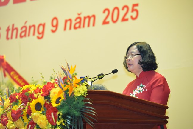 | Đồng chí Bùi Thị Minh Hoài, Ủy viên Bộ Chính trị, Bí thư Thành ủy Hà Nội phát biểu chỉ đại tại Đại hội |