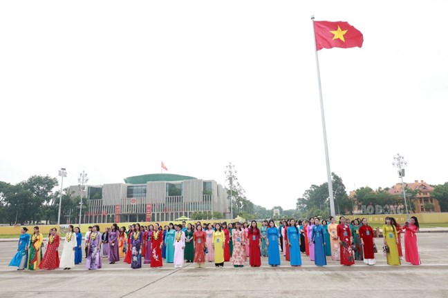 Thay mặt cho Đoàn đại biểu lên báo công với Bác, chị Nguyễn Thị Tú Anh - đoàn viên công đoàn, Quản lý sản xuất trực tiếp Công ty Cổ phần TKG Taekwang Vina - cho biết, sinh thời, Người luôn dành sự quan tâm đặc biệt đối với phụ nữ, trong đó có nữ đoàn viên và tổ chức Công đoàn. Tư tưởng của Người là kim chỉ nam cho mọi hoạt động, trong từng giai đoạn trưởng thành và phát triển của giai cấp công nhân và tổ chức Công đoàn Việt Nam. Bác cho rằng, phụ nữ là một nửa xã hội: “Non sông gấm vóc Việt Nam do phụ nữ ta, trẻ cũng như già, ra sức dệt thêu mà thêm tốt đẹp, rực rỡ.”