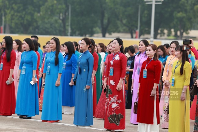 | Đoàn đại biểu nữ đoàn viên công đoàn tiêu biểu báo công dâng Bác. Ảnh: Hải Nguyễn |
