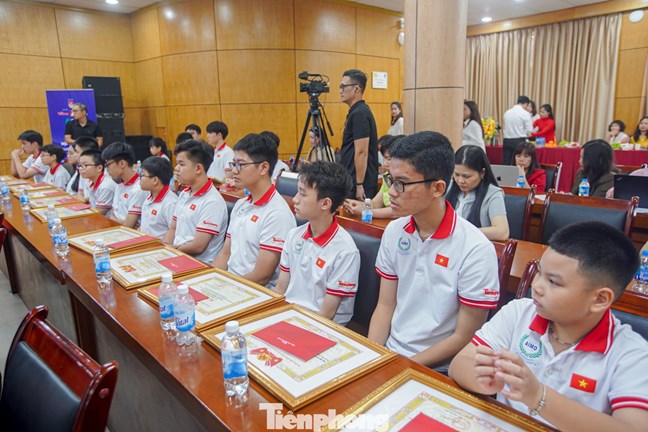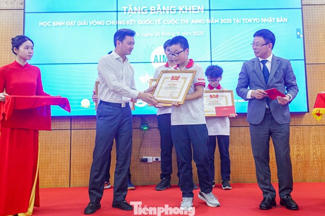 | Anh Nguyễn Minh Triết - Bí thư Trung ương Đoàn và nhà báo Phùng Công Sưởng - TBT Báo Tiền Phong tặng bằng khen cho các thí sinh đạt giải vòng chung kết quốc tế AIMO 2025. |