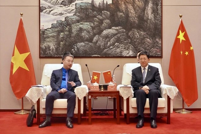 | Đồng chí Nguyễn Tường Lâm, Bí thư Trung ương Đoàn, Chủ tịch Trung ương Hội Liên hiệp thanh niên Việt Nam trò chuyện cùng đồng chí A Đông, Bí thư thứ nhất Trung ương Đoàn TNCS Trung Quốc tại buổi gặp. Ảnh: Trần Cường |