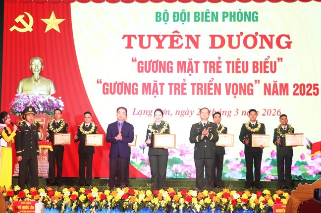 | Thiếu tướng Vũ Quốc Ân, Phó Chính ủy BTL BĐBP và đồng chí Đoàn Thị Hậu, Phó Bí thư Thường trực Tỉnh ủy, Chủ tịch HĐND tỉnh Lạng Sơn trao phần thưởng cho 10 gương mặt trẻ triển vọng BĐBP năm 2025 |