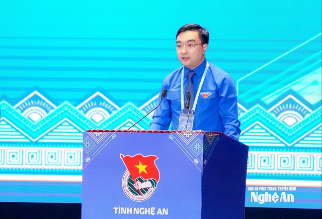 | Ông Hồ Phúc Hải - Phó Bí thư Tỉnh đoàn trình bày báo cáo tổng kết thực hiện Nghị quyết Đại hội giai đoạn 2022 - 2025 và phương hướng, mục tiêu, nhiệm vụ công tác Đoàn và phong trào Thanh thiếu nhi tỉnh Nghệ An nhiệm kỳ 2025 - 2030. Ảnh: Phạm Bằng |