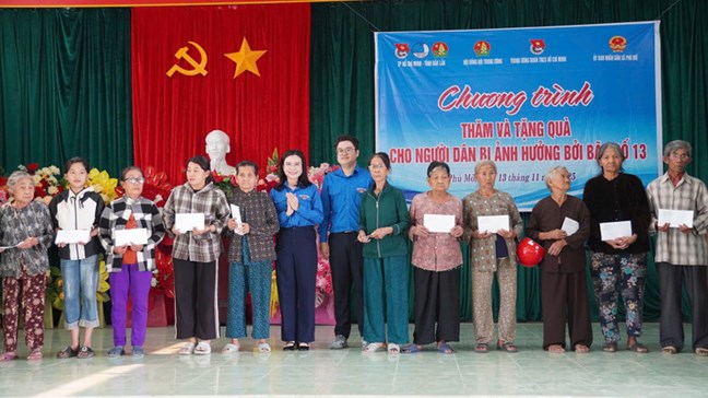 Trong đó, Trung ương Đoàn, Hội đồng Đội Trung ương hỗ trợ 400 triệu đồng cho thiếu nhi và người dân bị ảnh hưởng bởi cơn bão số 13 gây ra từ nguồn kinh phí hỗ trợ của Công ty trách nhiệm hữu hạn Amway Việt Nam, Công ty cổ phần Tập đoàn Bảo Tín; 3.000 phần quà dụng cụ học tập dành cho thiếu nhi, trị giá 300 triệu đồng từ Công ty cổ phần Tập đoàn Thiên Long.