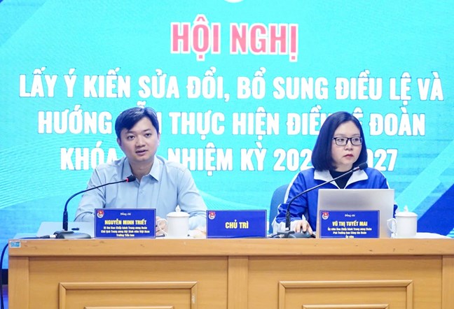 | Đồng chí Nguyễn Minh Triết, Ủy viên dự khuyết Trung ương Đảng, Bí thư thường trực Trung ương Đoàn, Chủ nhiệm Ủy ban Kiểm tra Trung ương Đoàn, Chủ tịch Trung ương Hội Sinh viên Việt Nam; đồng chí Vũ Thị Tuyết Mai, Ủy viên Ban Chấp hành Trung ương Đoàn, Phó trưởng ban Công tác Đoàn chủ trì hội nghị. Ảnh: Vũ Tuấn |