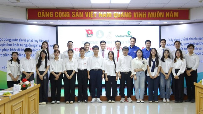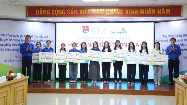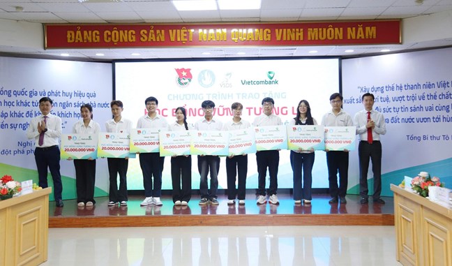 | Đại diện lãnh đạo T.Ư Đoàn, T.Ư Hội SVVN và Vietcombank trao tặng học bổng cho những sinh viên nghèo vượt khó |