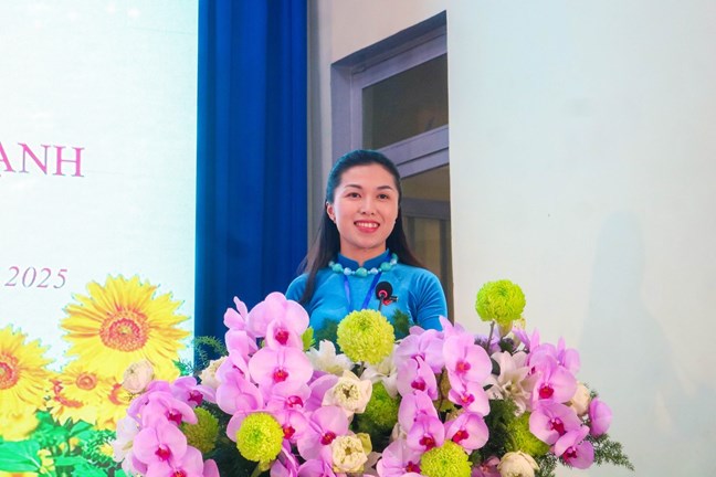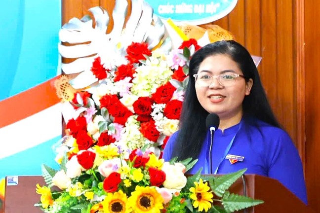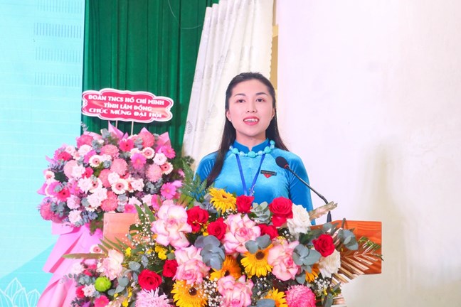 | Đồng chí Trần Diệp Mỹ Dung, Phó Bí thư Thường trực Tỉnh đoàn, Trưởng Ban Công tác Đoàn và Thanh thiếu nhi, Ủy ban MTTQ Việt Nam tỉnh Lâm Đồng phát biểu tại Đại hội |