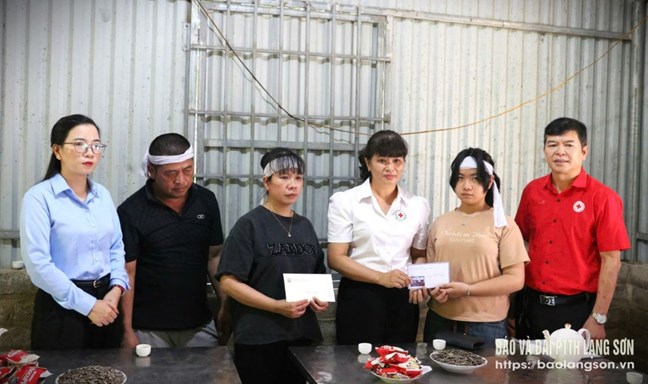 | Lãnh đạo Hội Chữ thập đỏ tỉnh thăm, động viên gia đình ông H.V.T, thôn Đồng Kết, xã Cai Kinh |